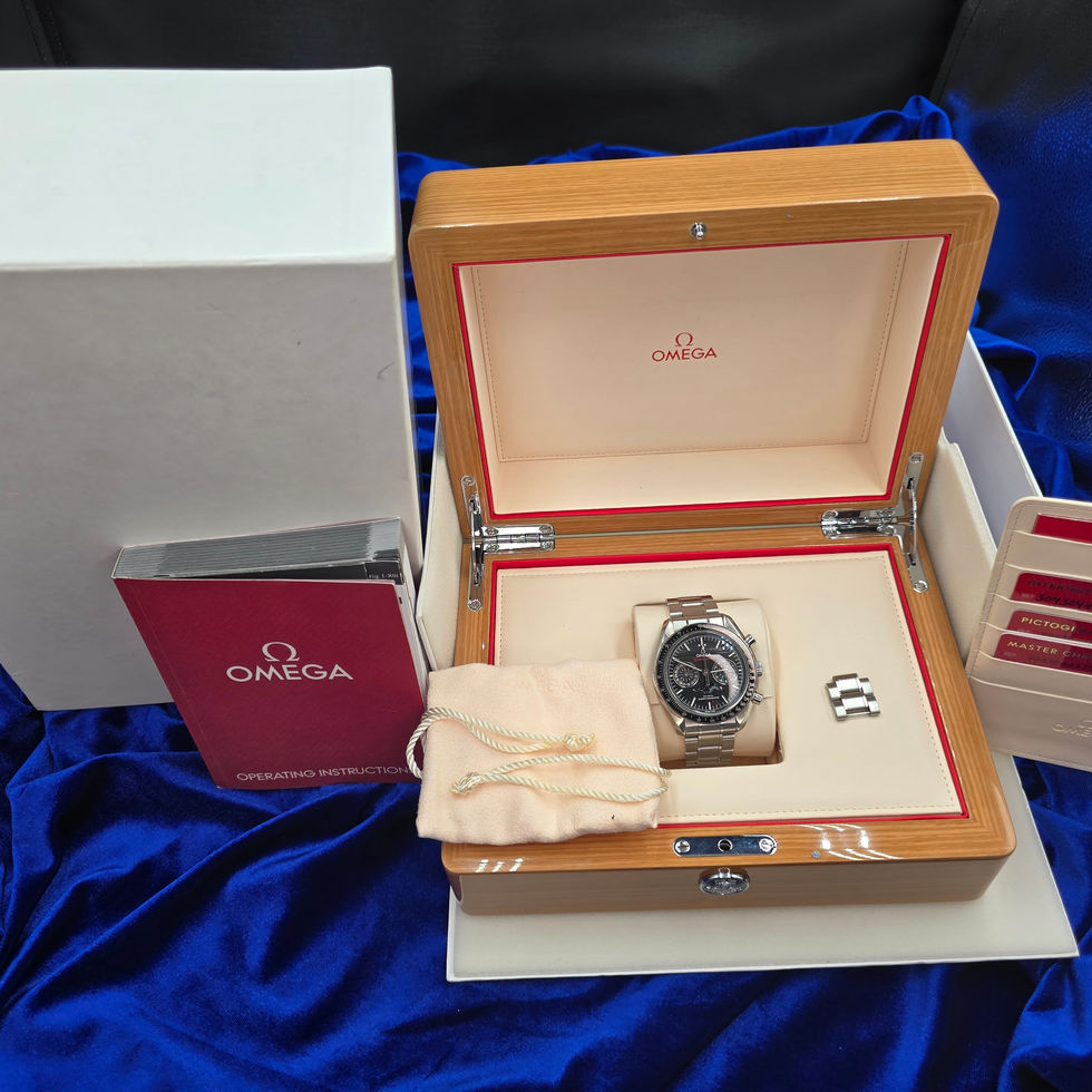 Presenting the stunning Omega Speedmaster Moonphase Moonwatch 44mm Reference 304.33.44.52.01.001. This iconic timepiece effortlessly merges the timeless appeal of Omega's Speedmaster collection with the unique allure of a moonphase complication, making it a standout for any discerning collector.